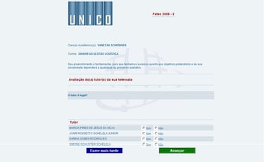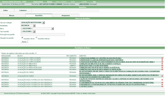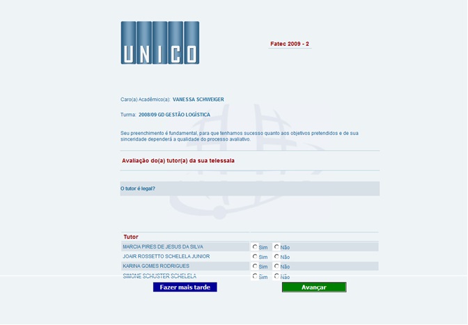 O Projeto de Avaliações Insitutcionais foi criado em 2008 a 2009, o objetivo era criar um módulo de cadastro de perguntas, respostas, tipos de perguntas e respostas ,criar avaliações com estes dados de maneira dinâmica , direcionando um determinado grupo de alunos ou curso(s) em especial, tudo sob escolha on-demand, disponibilizar a avaliação no portal do aluno, visualizar e coletar as respostas em um outro módulo e ainda fornecer dados para um relatório mais detalhado em PowerBI.