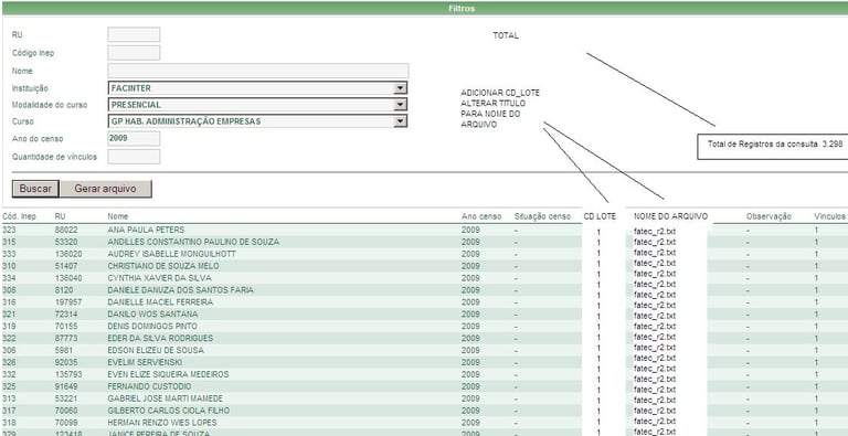 No primeiro ano em 2009 como não foi possível desenvolver o sistema, precisei gerar toda a massa de dados de forma manual com "Stores Procedures" direto no banco de dados SQL Server, posteriormente desenvolvi um sistema capaz de buscar informações e gerar estes lotes de arquivos.