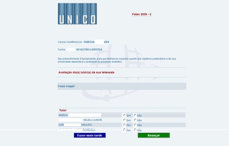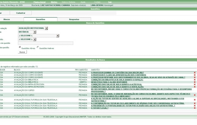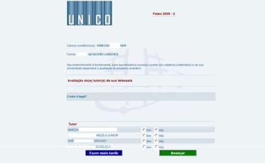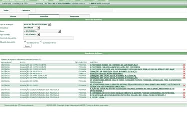 O Projeto de Avaliações Insitutcionais foi criado em 2008 a 2009, o objetivo era criar um módulo de cadastro de perguntas, respostas, tipos de perguntas e respostas ,criar avaliações com estes dados de maneira dinâmica , direcionando um determinado grupo de alunos ou curso(s) em especial, tudo sob escolha on-demand, disponibilizar a avaliação no portal do aluno, visualizar e coletar as respostas em um outro módulo e ainda fornecer dados para um relatório mais detalhado em PowerBI.