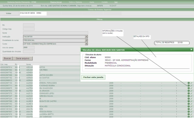 O Principal objetivo desde projeto era participar anualmente de um evento em Brasília - DF no Ministério da Educação. Havia um modelo padrão de exportação de dados para todas as universidades do país. Atuei como representante de TI da Faculdade junto a demais membros do corpo docente, entendendo os modelos e trazendo conhecimento para as equipes desenvolverem um sistema capaz de exportar e corrigir em tempos todas as informações necessárias da instituição; alunos, disciplinas, docentes, cursos entre outras. Por fim gerar lotes de arquivos que possibilitem fazer o upload na plataforma do INEP, de acordo com os prazos estabelecidos.